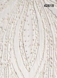 The design is intricately embellished with delicate beadwork, sequins, crystals, and textured elements, forming radiant vertical patterns that add depth and dimension. Subtle multicolor highlights blend seamlessly with the soft ivory base, giving the fabric a luminous and rich couture finish. The combination of detailed hand embroidery and structured motif placement creates a stunning balance of elegance and glamour.