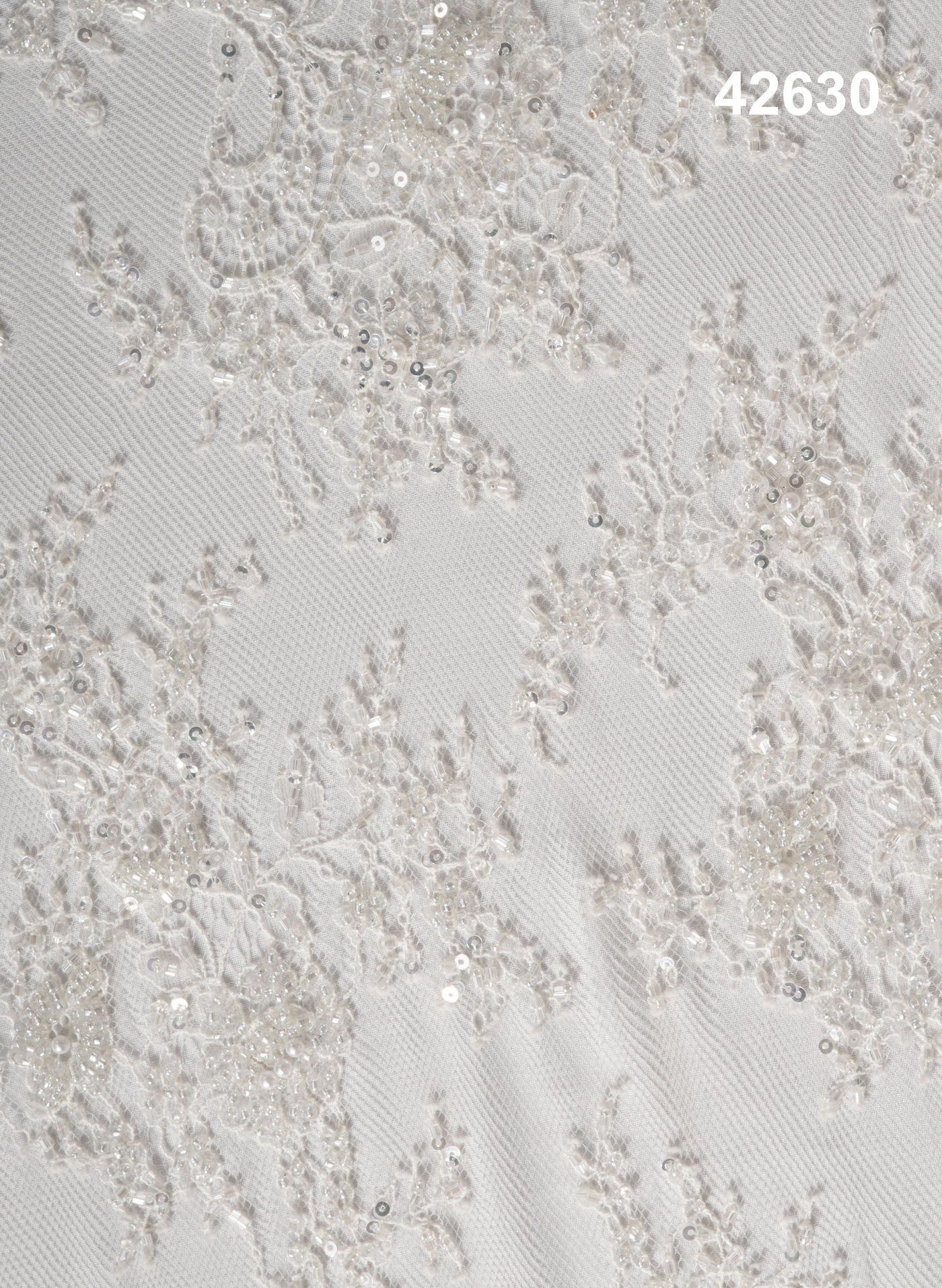 The elaborate pattern flows seamlessly across the surface, blending regal scrollwork with softly clustered floral detailing to create a harmonious and sophisticated composition. The refined ivory tone enhances the luminous beadwork, offering a graceful shimmer that captures light beautifully while maintaining classic bridal refinement.