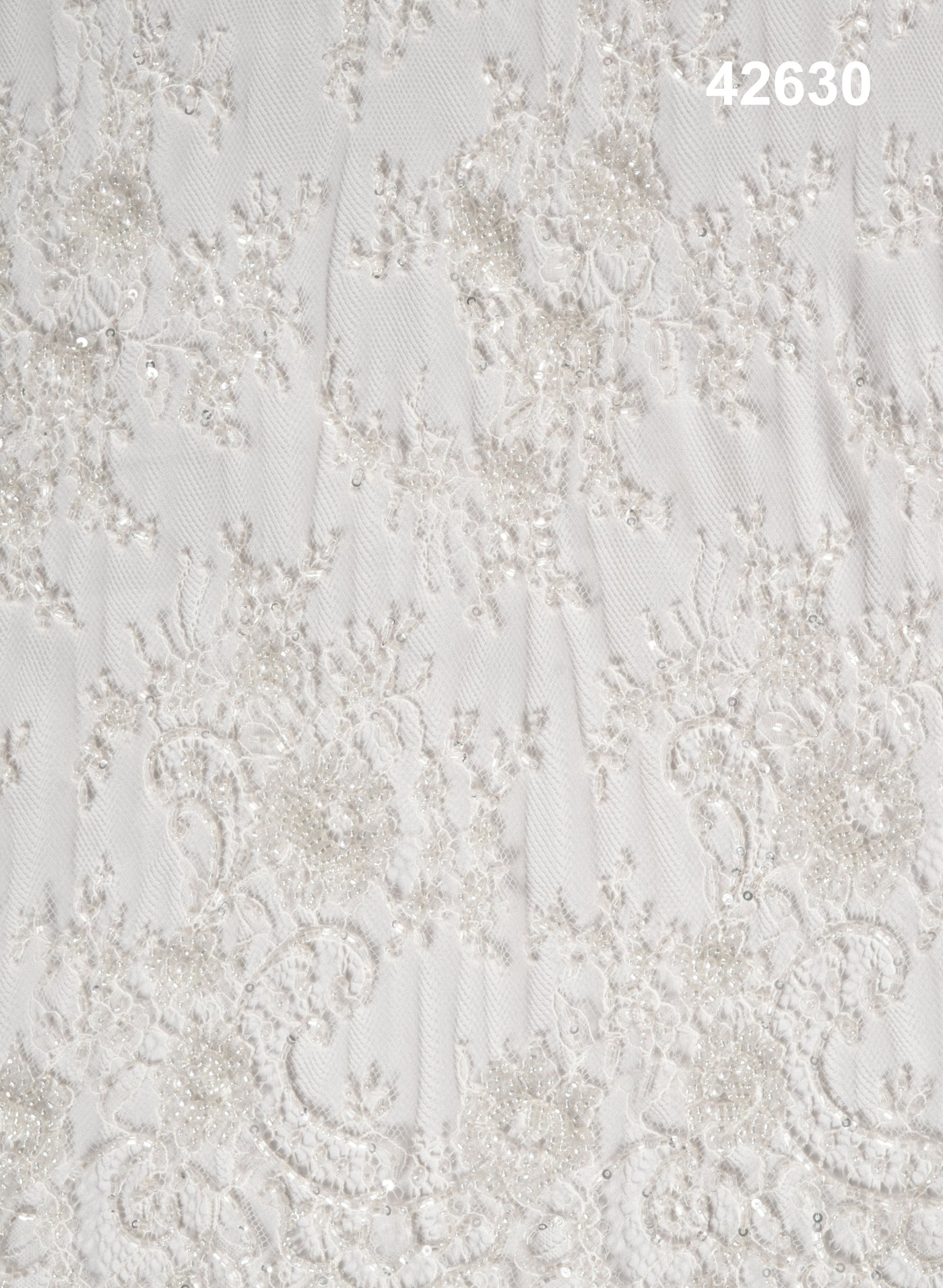 Perfect for bridal gowns, cathedral veils, statement lehengas, and luxurious overlays, this fabric provides rich texture, depth, and couture craftsmanship. The elegant motif distribution makes it ideal for structured silhouettes, dramatic trains, and intricately detailed bodices.