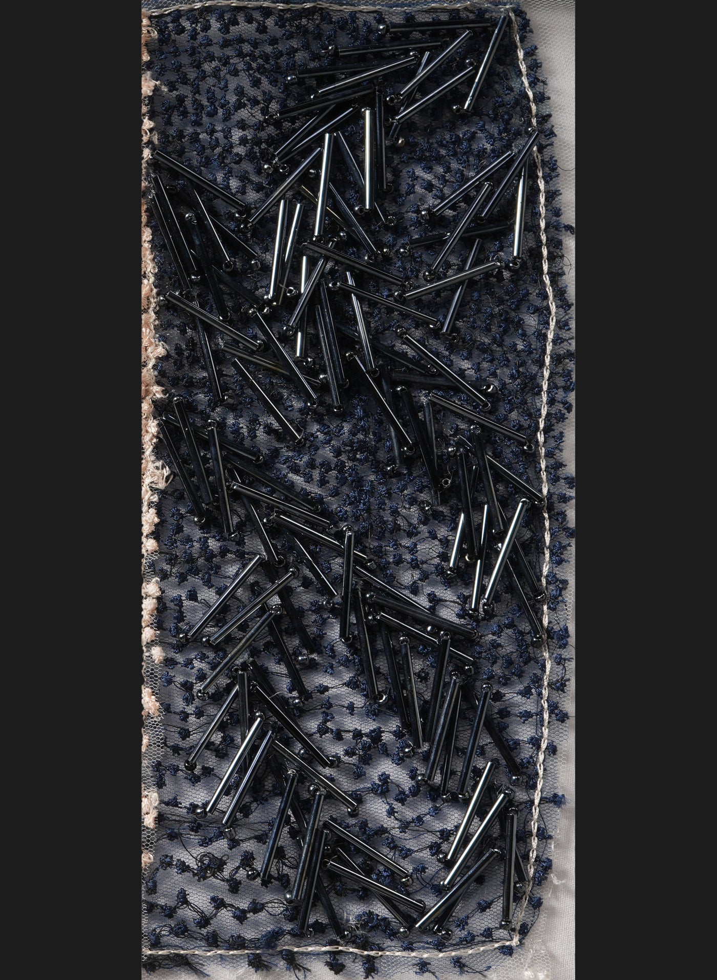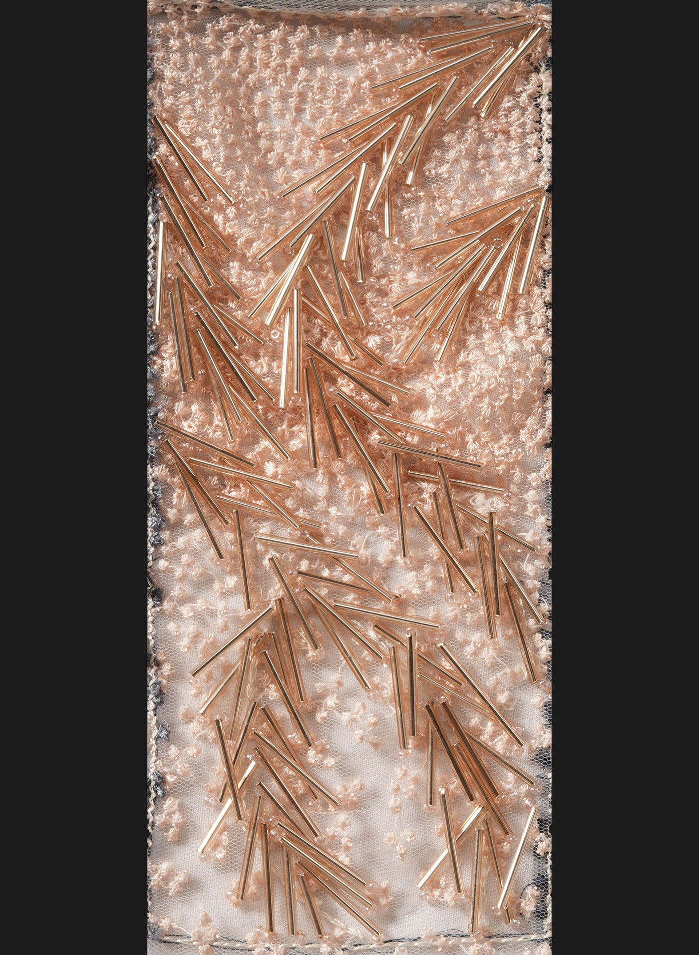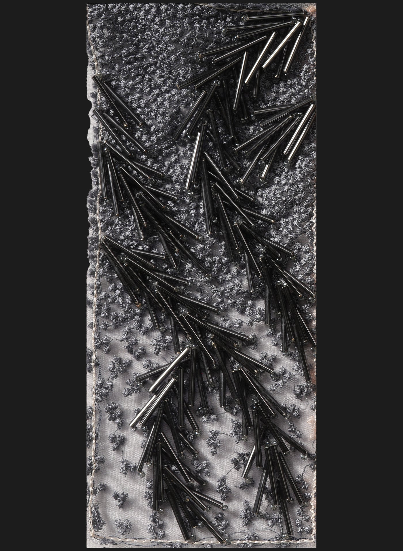 The multicolor embellishments add depth and dimension, allowing the fabric to shimmer beautifully under light. The dense linear placement of the beads forms a modern, high-fashion aesthetic with dramatic movement and contemporary elegance.