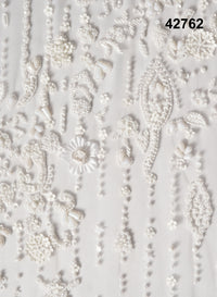 Perfect for bridal gowns, reception ensembles, couture lehengas, veils, and statement blouses, this fabric radiates sophistication and elegance. At the same time, its refined design also makes it suitable as a premium normal fabric for evening dresses, festive wear, overlays, and designer silhouettes.