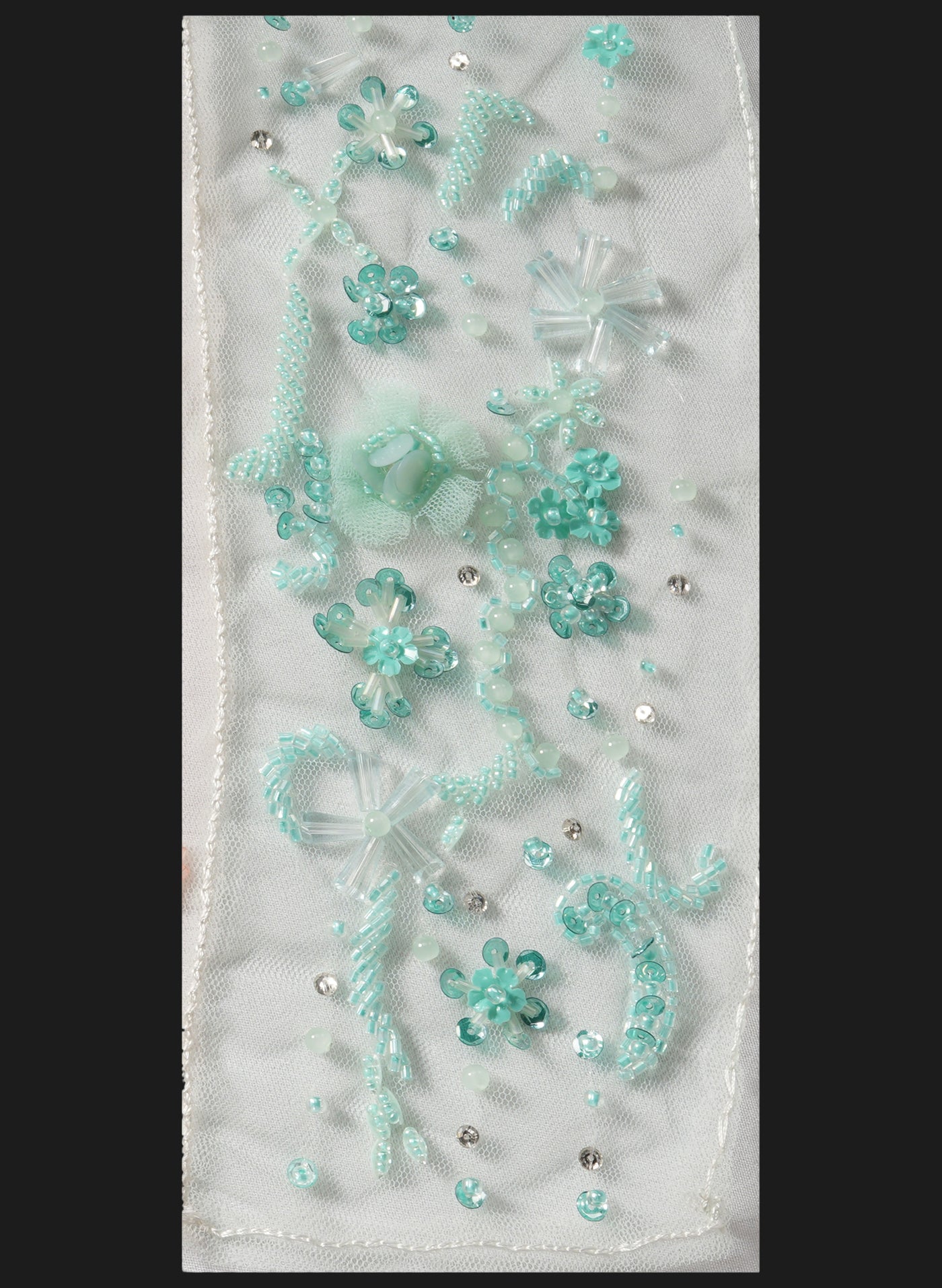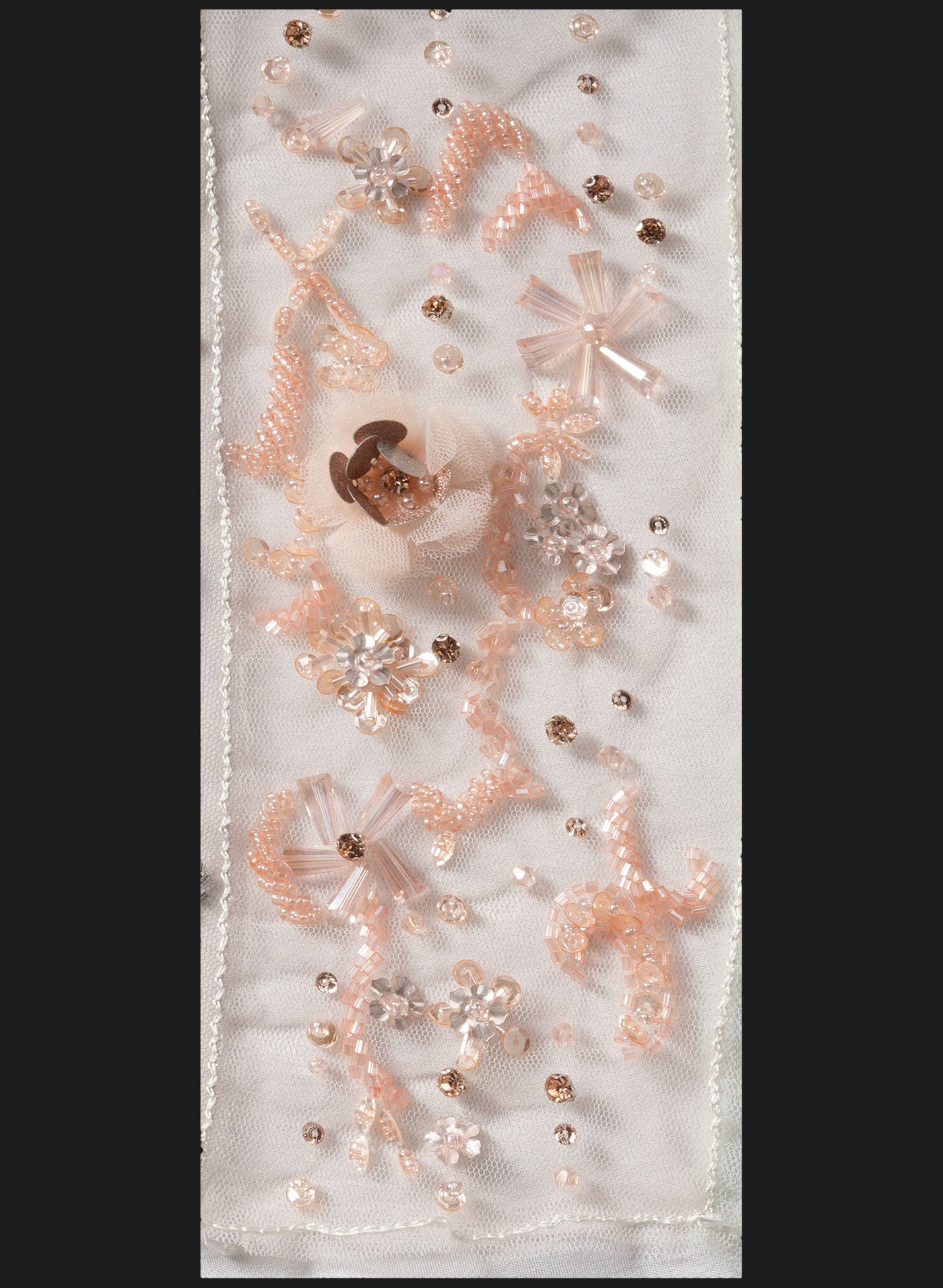 The surface is enhanced with a subtle multicolor blend of tonal embellishments, delicately layered to add depth, texture, and soft luminosity. Three-dimensional floral elements and detailed bead clusters are thoughtfully arranged with cascading vertical accents, offering graceful movement and a timeless couture appeal.
