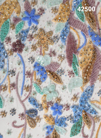 Infuse your designs with artistic elegance using our Multicolor Botanical Hand-Beaded Fabric, a richly detailed couture textile crafted for designers who appreciate colour, texture, and intricate handwork. Created on a fine net base, this fabric features flowing botanical motifs composed of meticulously hand-applied beads, sequins, crystals, and embroidery in a harmonious multicolor palette including soft blues, mint, mauve, gold, and champagne tones.