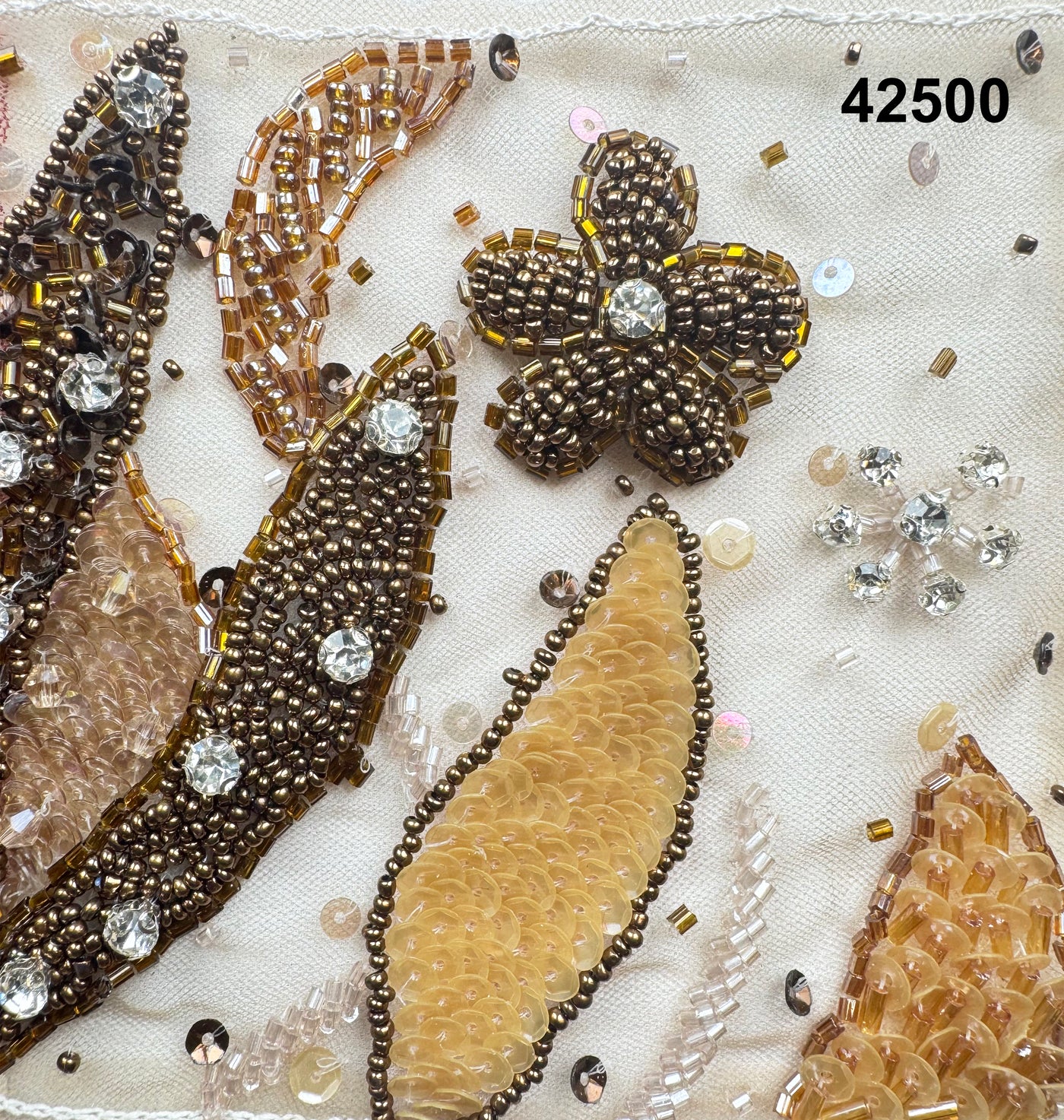 The organic placement of leaves, florals, and vine-like elements creates a sense of graceful movement, while dimensional beadwork adds depth and refined sparkle. Each motif is thoughtfully detailed, resulting in a balanced surface that feels luxurious yet light.