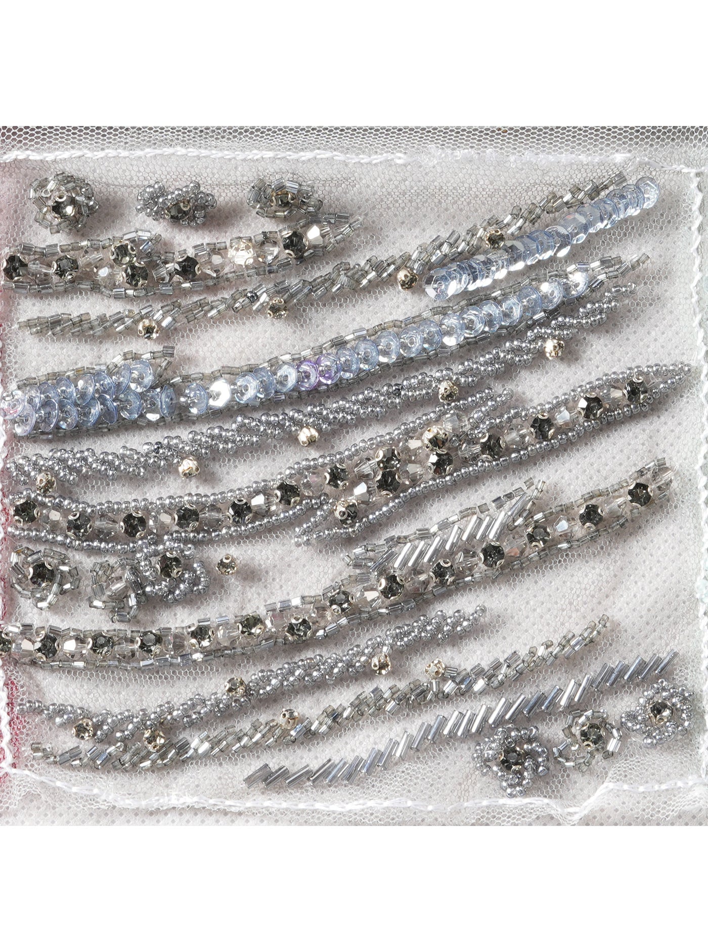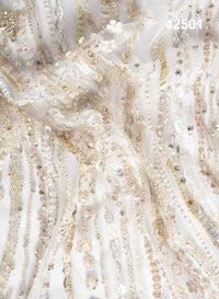 Illuminate bridal silhouettes with our Ivory & Silver Radiant Bridal Hand-Beaded Fabric, a statement couture textile designed for brides who seek modern glamour with timeless elegance. Crafted on a sheer fine net base, this fabric features flowing, wave-like patterns formed with meticulously hand-applied silver beads, sequins, crystals, and subtle metallic accents.