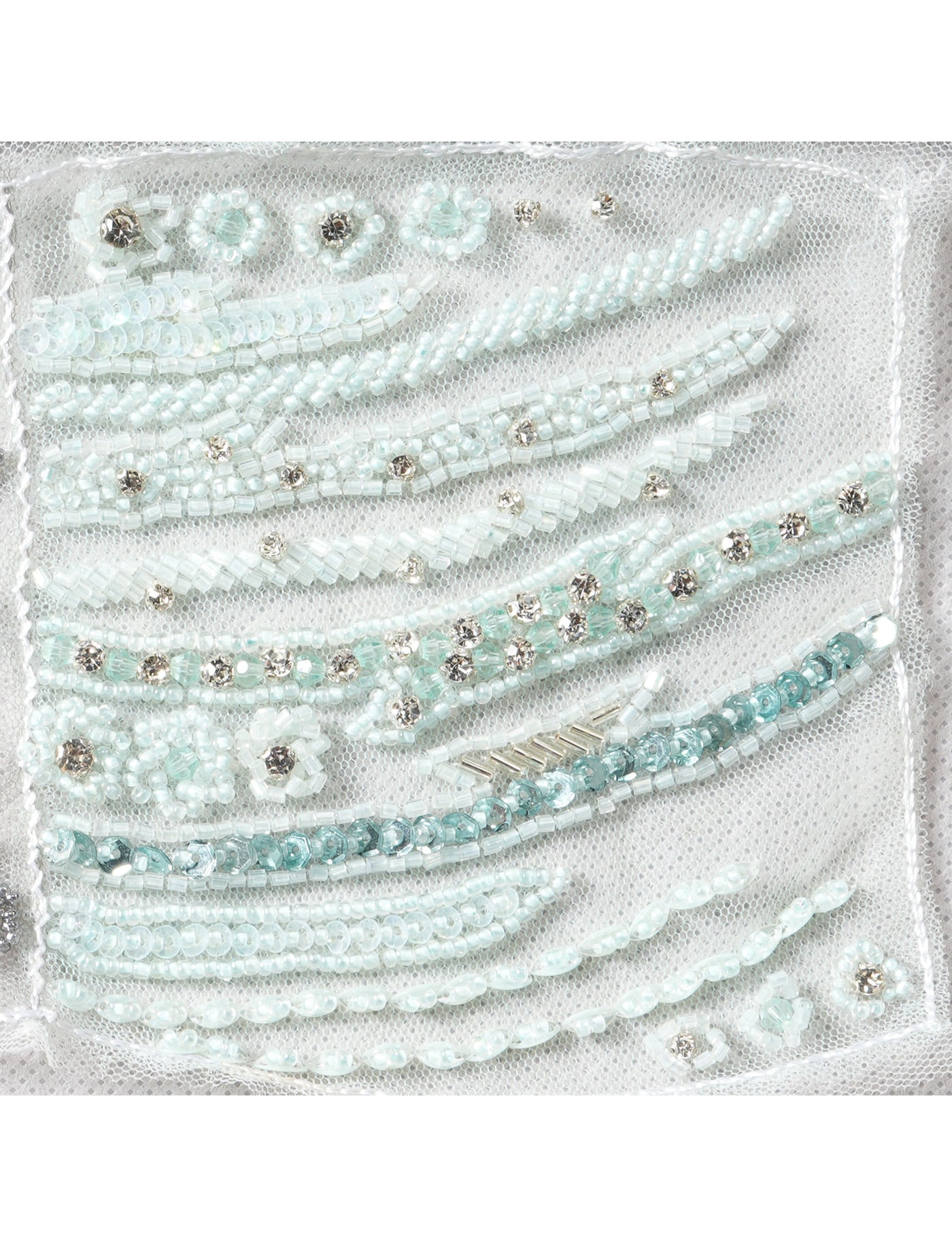 The dynamic linear motif creates a sense of movement and radiance, while the layered embellishment adds depth and refined sparkle that catches the light beautifully. Each element is thoughtfully arranged to enhance the natural contours of the body, making it especially suited for sculpted bodices and fluid bridal silhouettes.