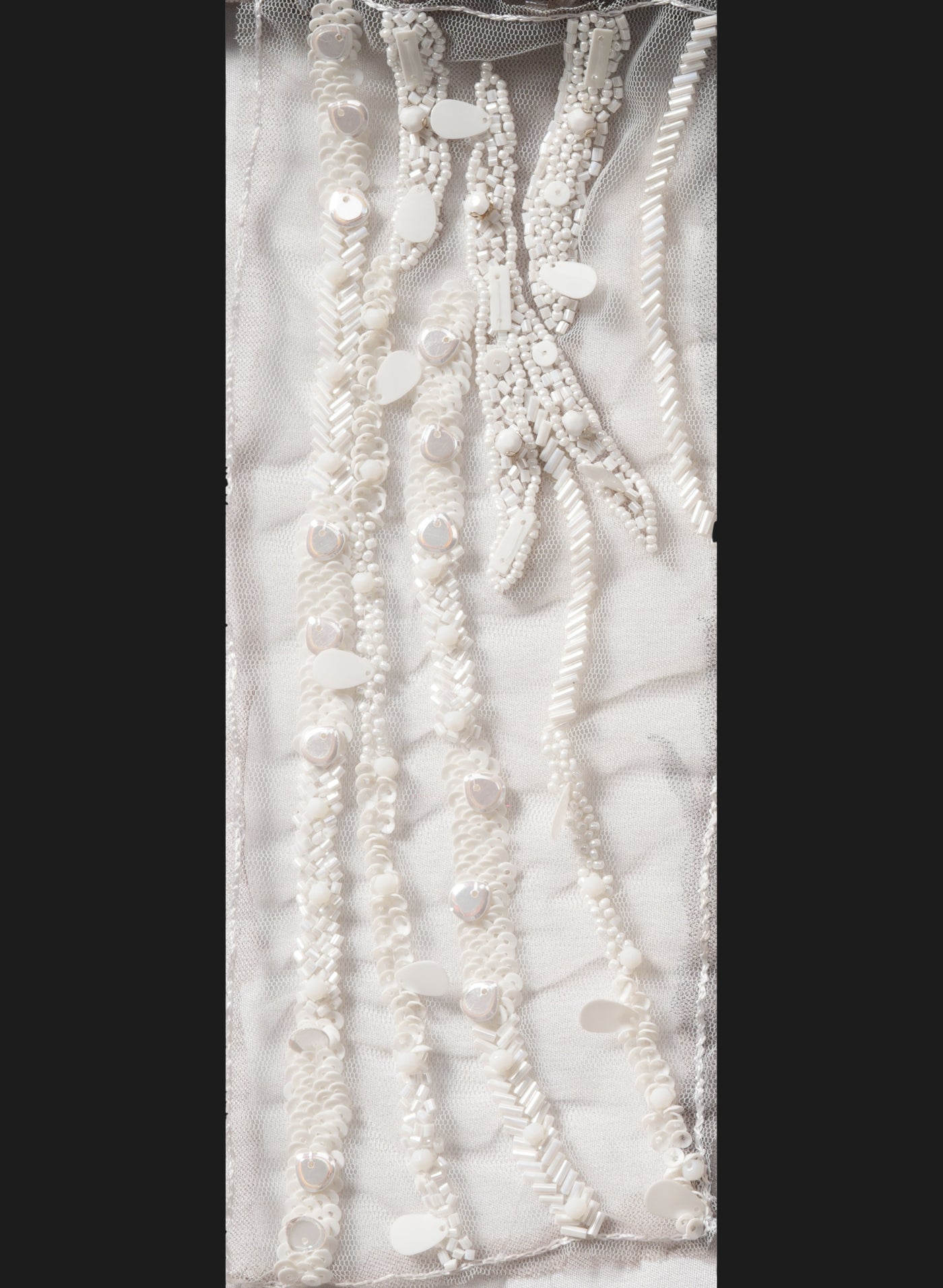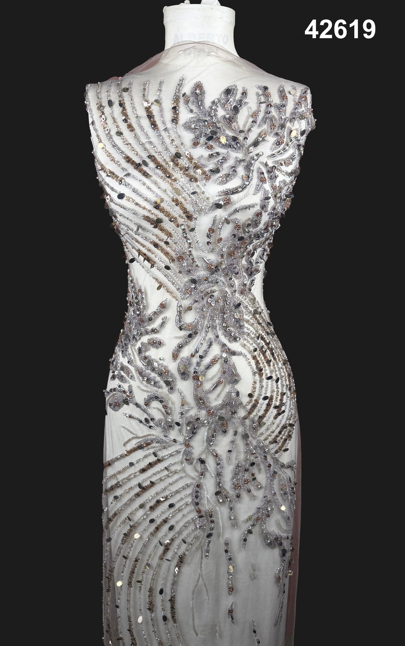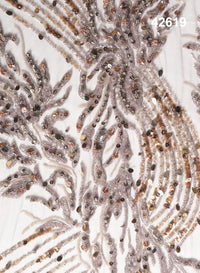 Designed in a warm multicolor palette of rose gold, blush, champagne, bronze, and antique metallic tones, the embellishments create a luminous, high-shine surface with exceptional depth and texture. The dynamic arrangement of elongated leaf patterns and cascading beadwork adds graceful movement and dramatic couture appeal.