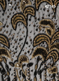 The design is richly embellished with intricate beadwork, sequins, crystals, and metallic accents, forming layered botanical patterns with remarkable texture and depth. The stunning multicolor palette blends deep black tones with shimmering gold, bronze, and subtle metallic highlights, creating a captivating contrast that enhances the richness of the fabric. Scattered sequins and crystal elements add a radiant sparkle, making the fabric visually dynamic and luxurious.