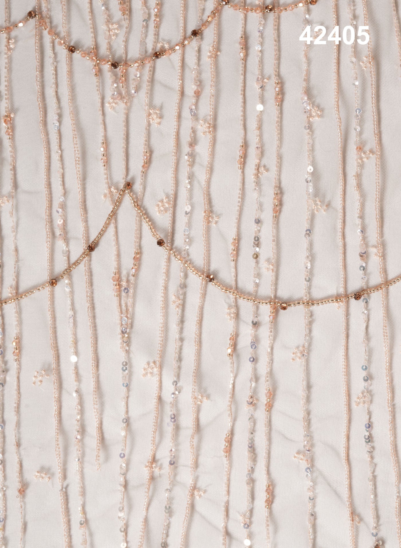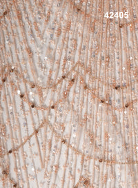 Discover the beauty of exquisite craftsmanship in this peach-colored beaded masterpiece, where hand and machine techniques merge to create an enchanting abstract floral design. The soft peach hue serves as a perfect backdrop for the delicate, intricate thread work, enhancing the luxurious flow of the piece. The abstract floral patterns are brought to life with a combination of delicate sequins and exotic beads, each strategically placed to add depth, texture, and an iridescent sparkle that dances with light. Every bead and sequin is thoughtfully arranged to achieve an elegant balance, ensuring that this stunning design emanates sophistication and charm. The delicate threadwork intricately weaves together the elements, highlighting the artistic flair behind this timeless piece. Ideal for adding a refined touch to high-end garments, accessories, or bespoke creations, this design embodies grace and opulence, making it perfect for those who seek both elegance and artistry in their collection. Let the abstract floral design captivate your senses, blending modern aesthetics with timeless beauty, making it a treasured addition to your wardrobe or decor.