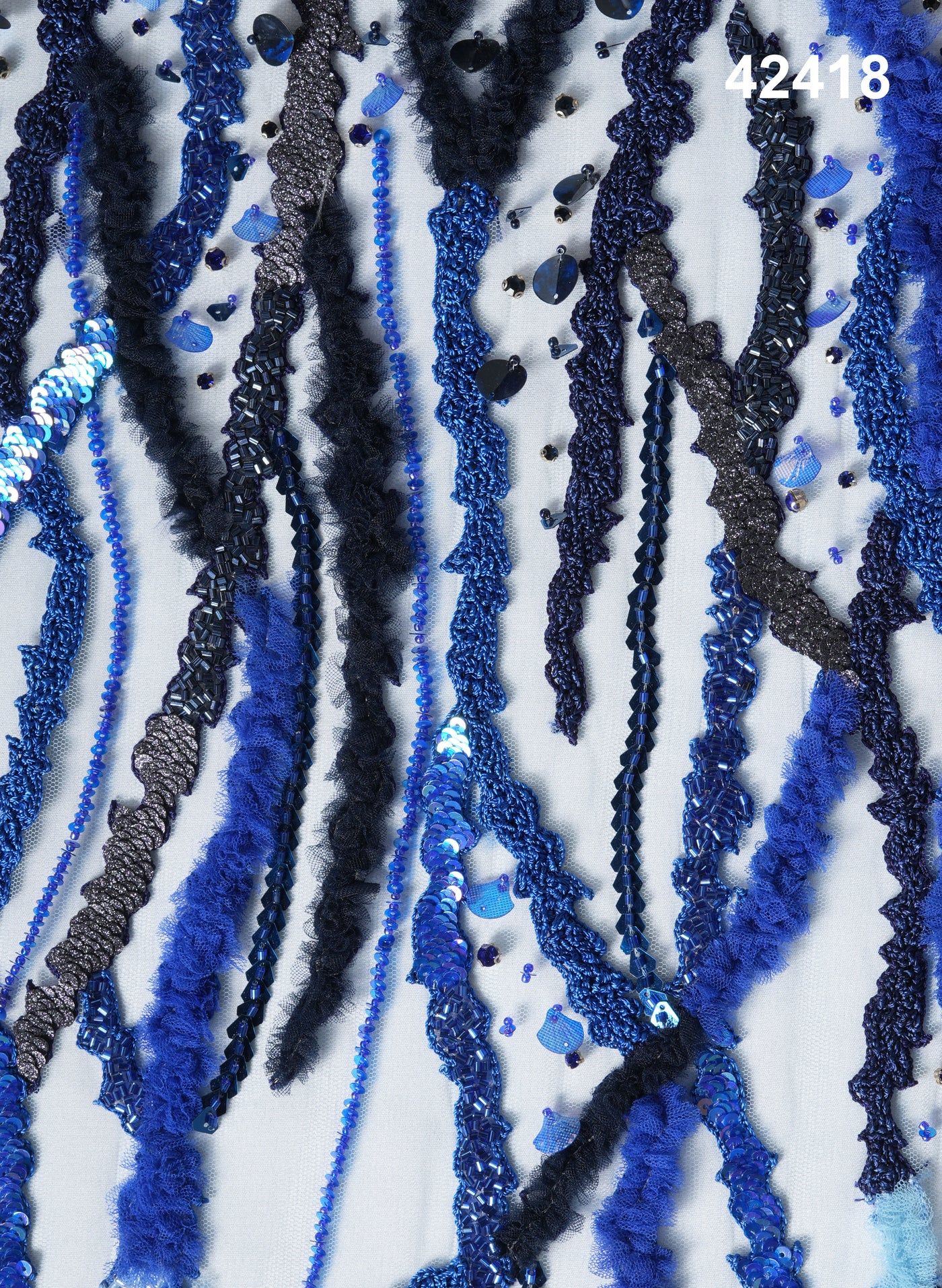 Immerse yourself in the artistry of this exquisite hand-beaded fabric, featuring an abstract design in a harmonious blend of blue shades. Each intricate detail is enhanced with a stunning combination of beads, sequins, rhinestones, and appliqué work, creating a visually striking piece that brings depth, texture, and luxury to any garment or accessory. The varying tones of blue, from deep navy to soft azure, come together to form an eye-catching design that radiates elegance and modern sophistication.