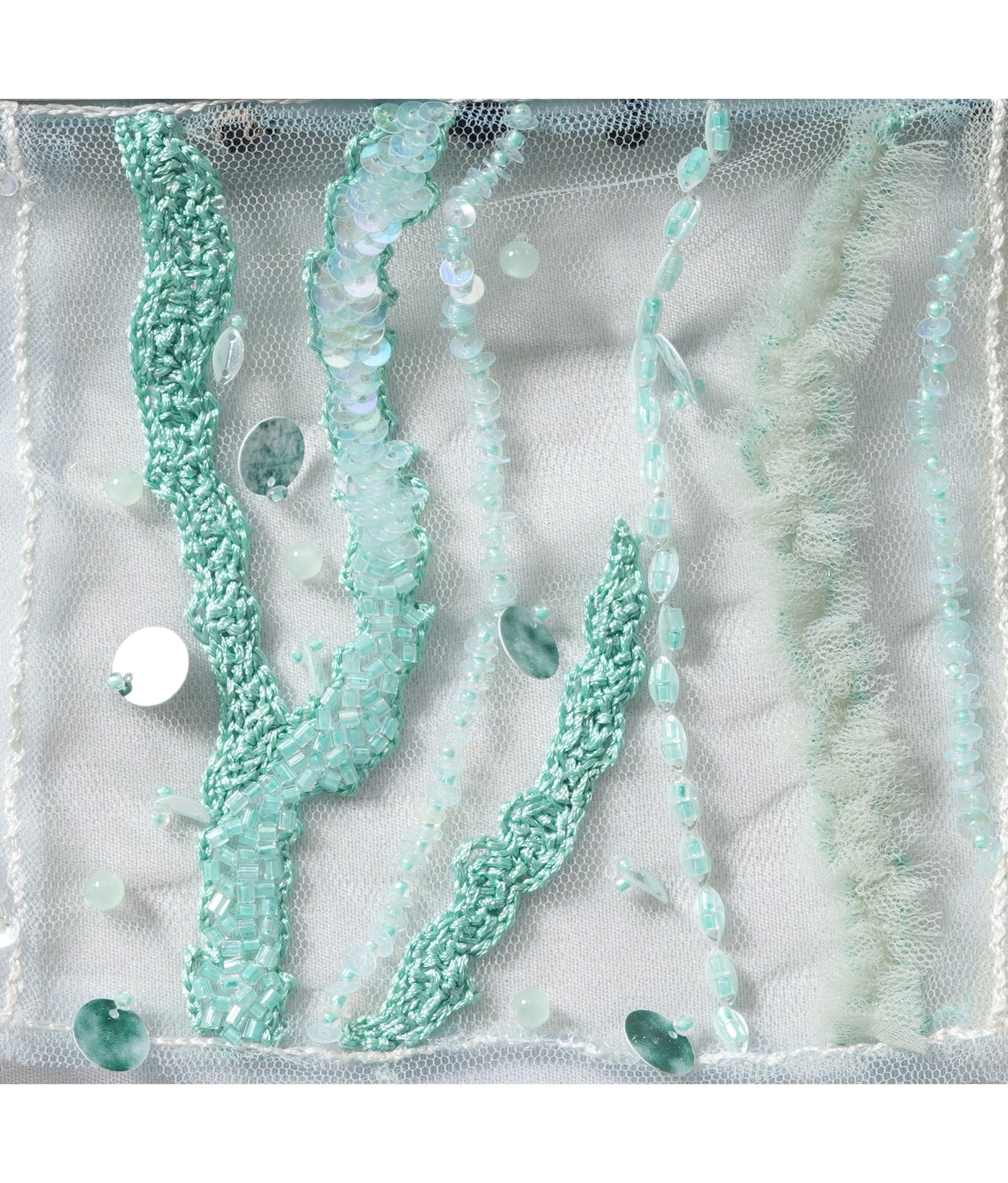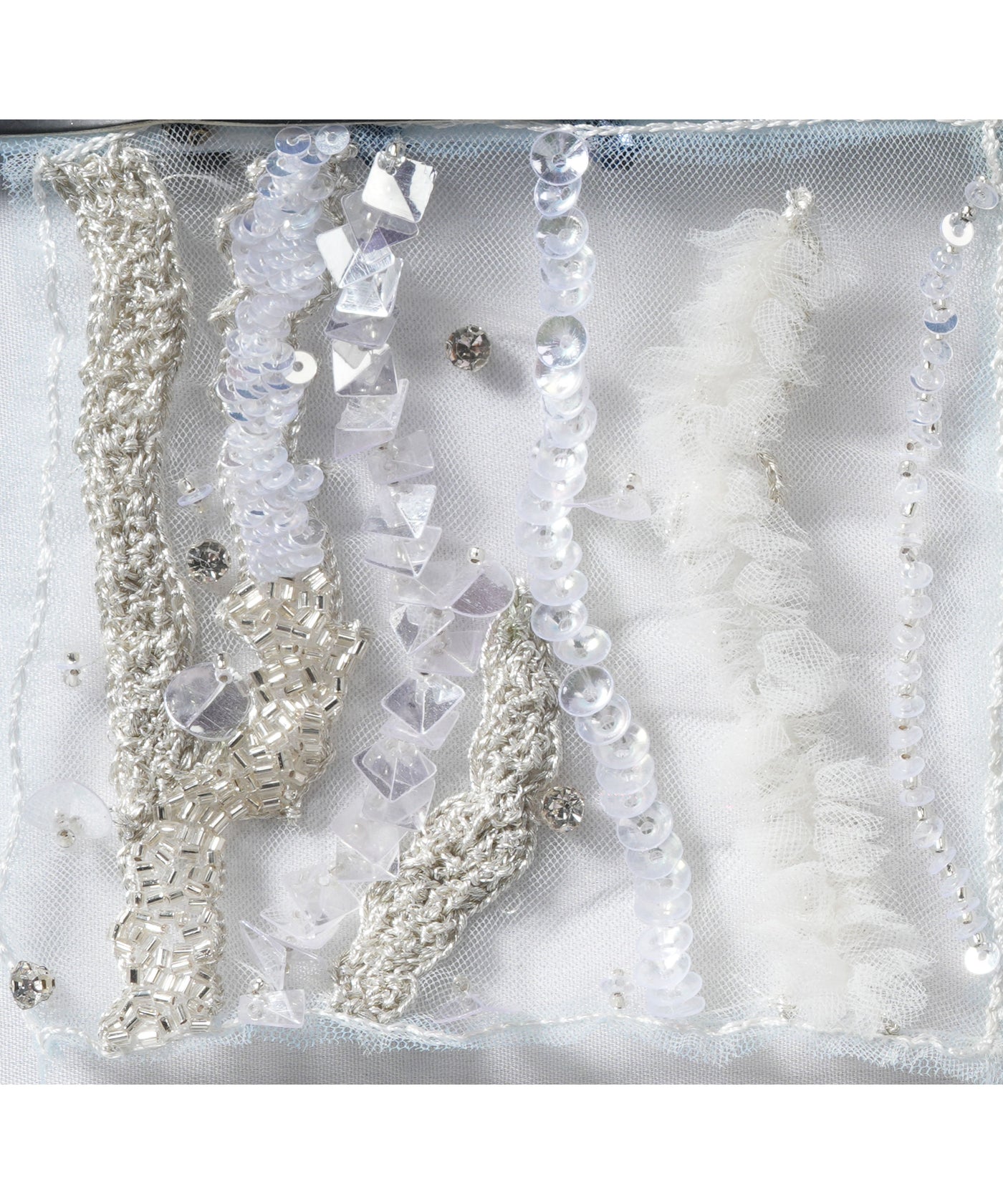 This hand-beaded fabric is ideal for a wide range of high-fashion creations, from glamorous evening gowns and cocktail dresses to one-of-a-kind accessories and statement pieces. Whether used for a sophisticated bridal gown, a lavish cocktail dress, or a striking custom accessory, the combination of sequins, beads, rhinestones, and appliqué ensures that your design will have a show-stopping quality. The abstract design in shades of blue adds a unique artistic flair, making it perfect for those looking to craft a truly memorable, luxurious look that will shine with elegance and brilliance.