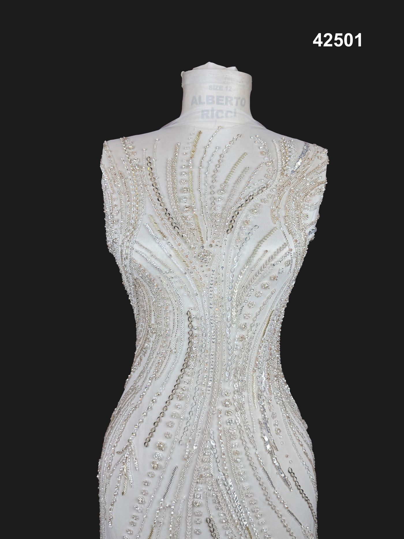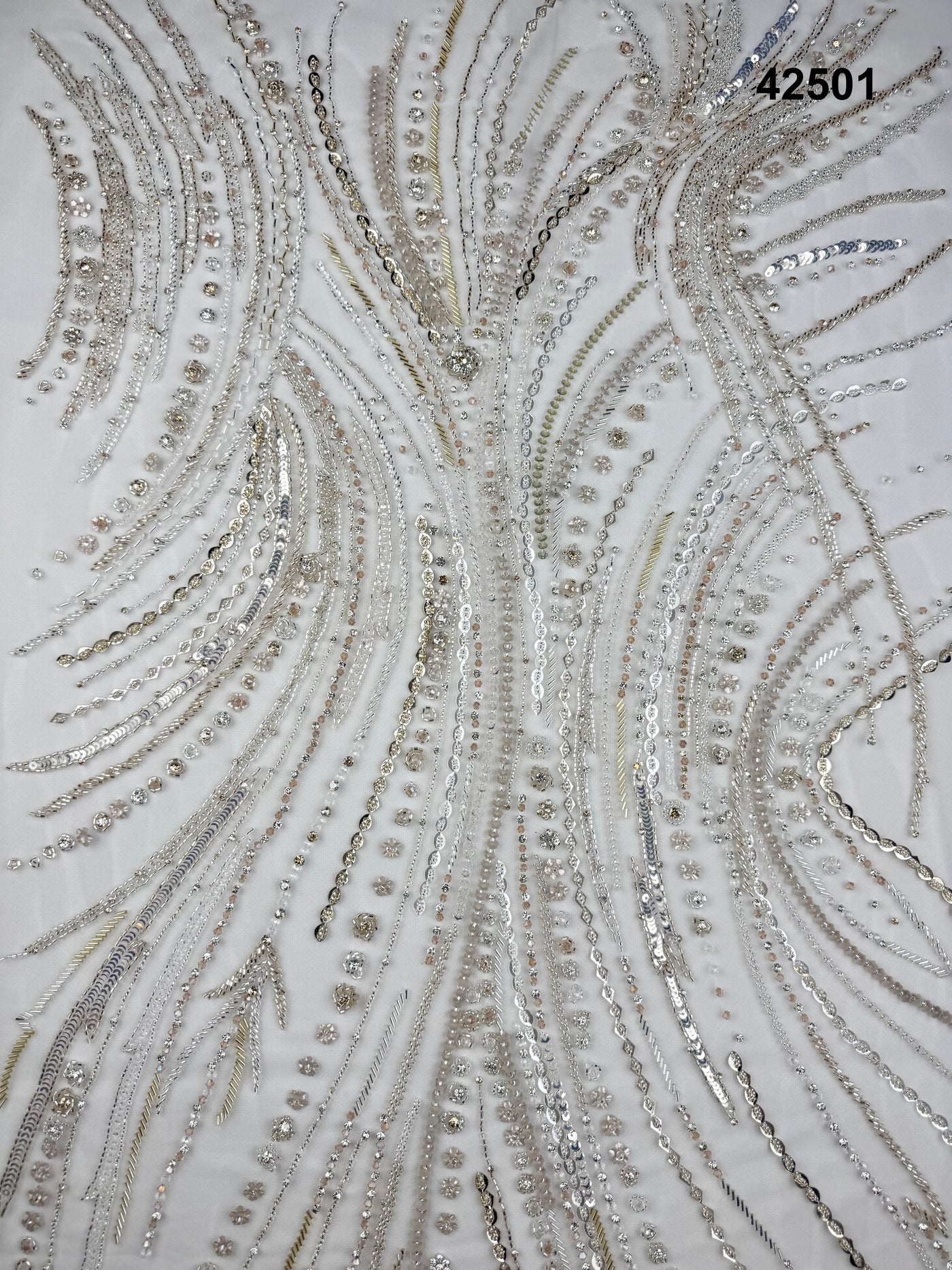 #42501 Ivory & Silver Radiant Bridal Hand-Beaded Fabric – Luxury Textile for Bridal Couture & Bespoke Gowns