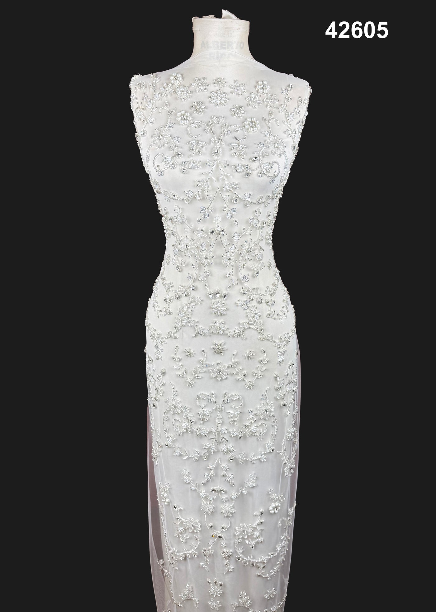The motifs are thoughtfully spaced to allow the design to breathe, forming an airy yet richly detailed surface. The soft ivory-white palette enhances its classic bridal appeal, while the crystal highlights add a refined shimmer that catches the light beautifully from every angle.