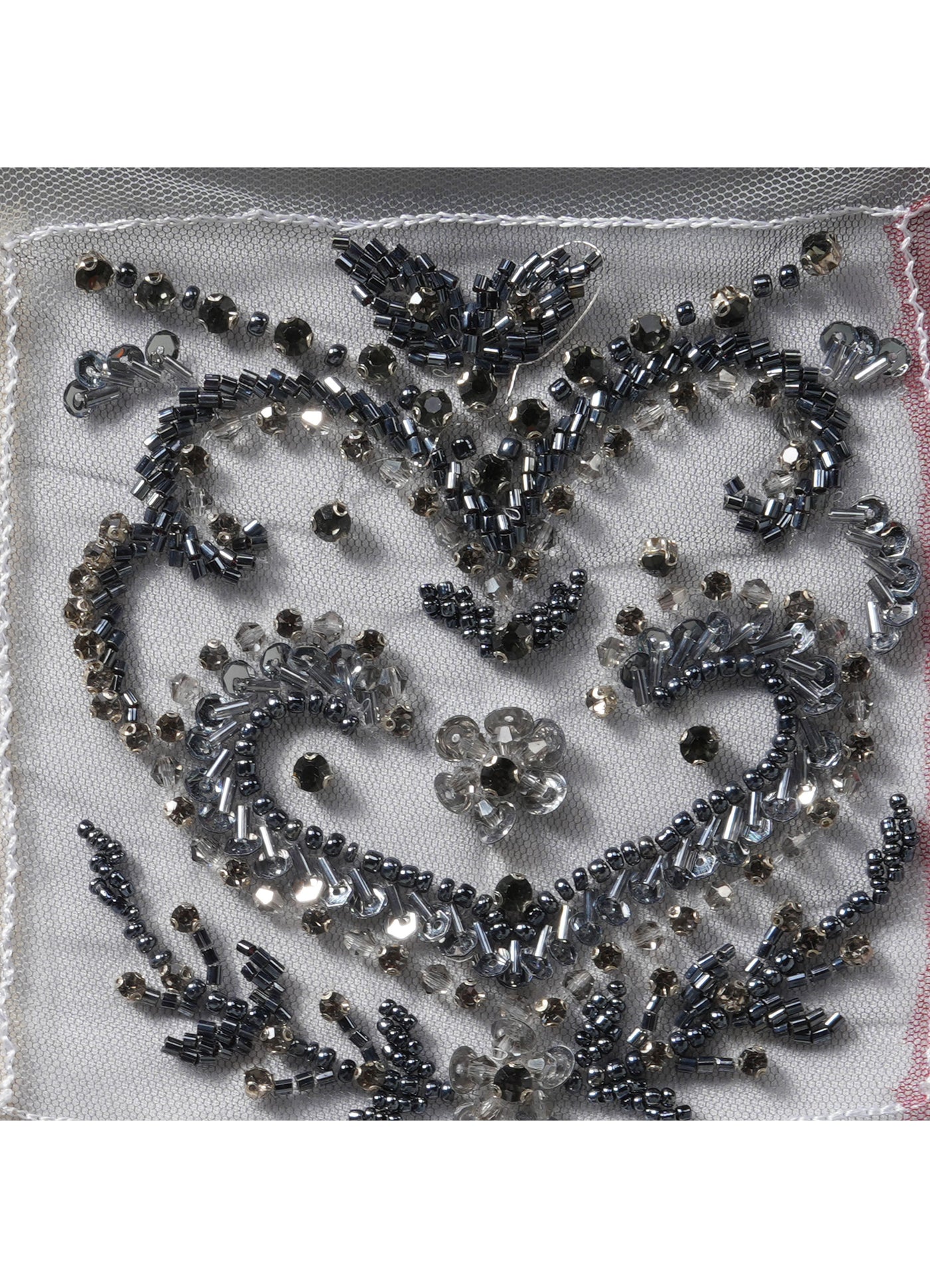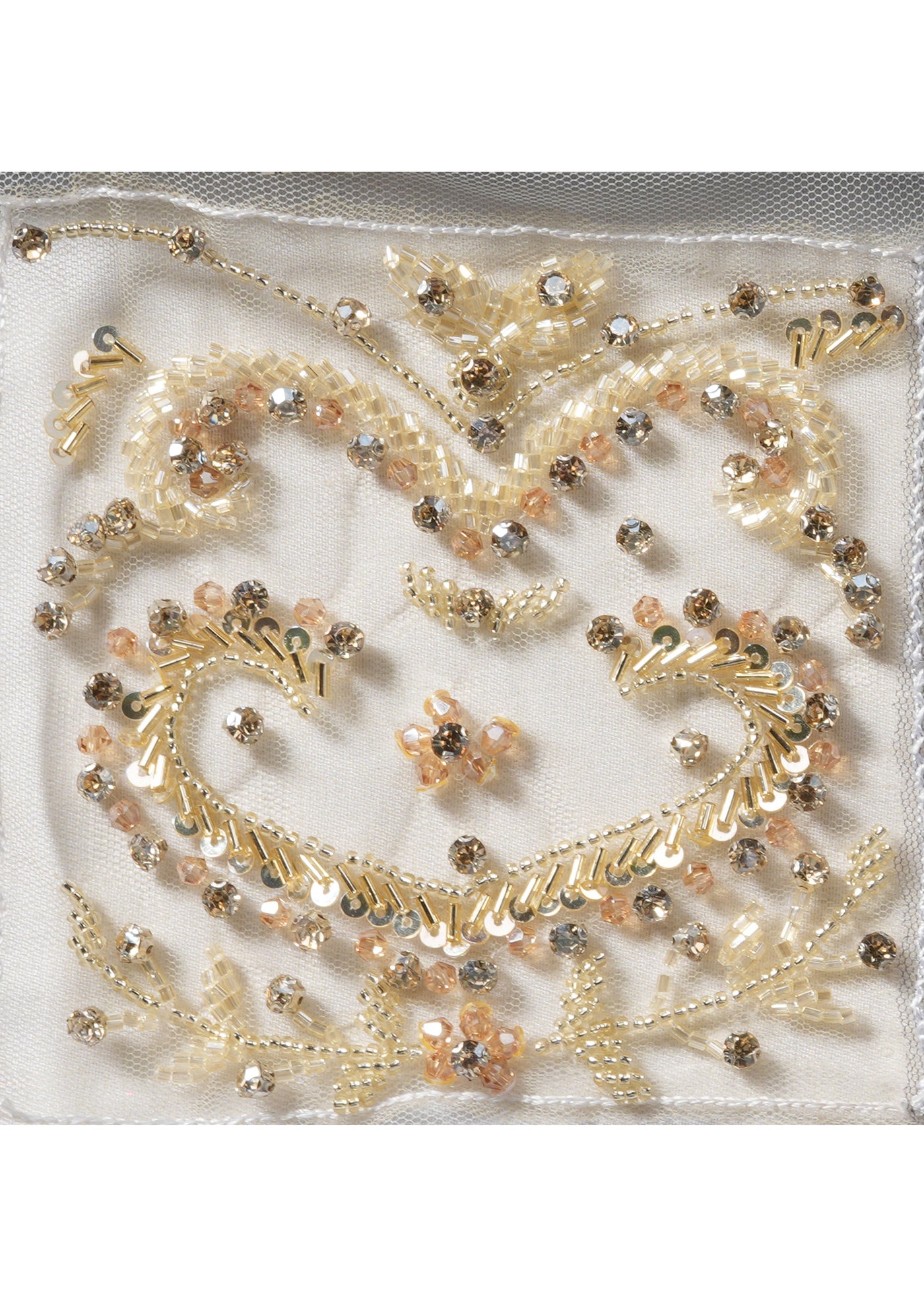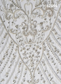 The harmonious blend of crystal clear, champagne gold, soft silver, and iridescent accents creates a refined multicolor effect, offering depth, brilliance, and a luxurious finish. The combination of linear bead trails and ornate swirling patterns adds movement and dimension, making the fabric visually captivating yet elegantly balanced.