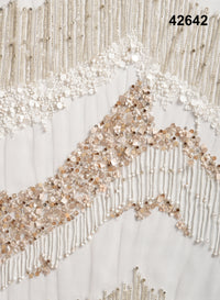 Elevate your couture designs with our Opaline Wave Multicolor Crystal & Beaded Net Fabric, intricately hand-embellished on a soft sheer net base. This refined textile features flowing wave-inspired patterns created with meticulously arranged seed beads, sequins, bugle beads, and faceted crystals.