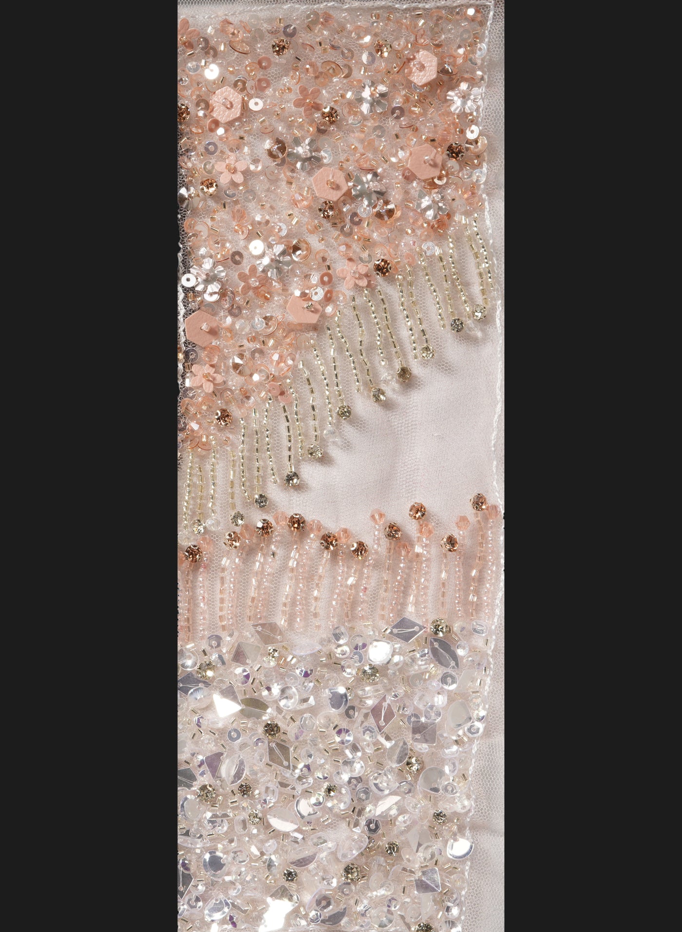 The design highlights a sophisticated multicolor palette of ivory, pearl white, champagne, blush nude, and subtle hints of gold, forming a luminous interplay of light and texture. Dense crystal clusters are beautifully contrasted with delicate linear beadwork, creating dimension, movement, and a graceful sculpted effect across the surface.